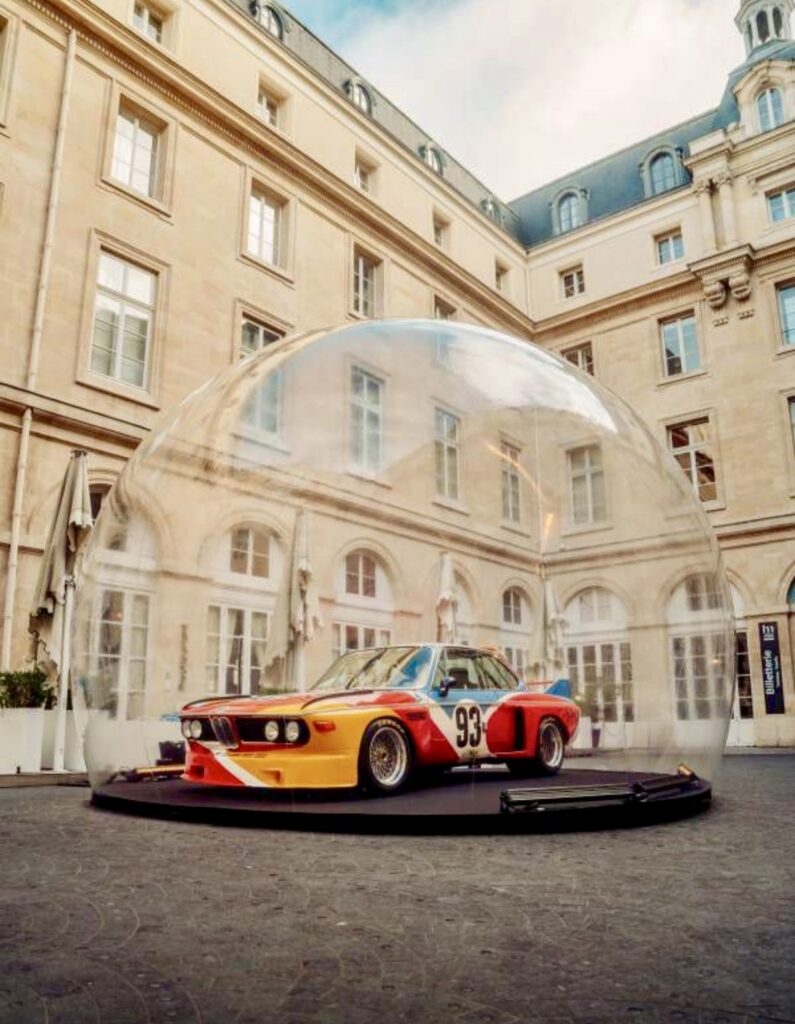 Tornando alle Art Car, sono letteralmente la copertina dell’evento: la 3.0 CSL Calder appare sulle locandine di Rétromobile 2026, dove la sua livrea si estende sulla carta diventando parte integrante dell’immagine. Inoltre, per promuovere la fiera, nel weekend precedente l’apertura, l’auto ha troneggiato nel patio dell’Hôtel de la Marine, in Place de la Concorde, protetta come una reliquia da una sfera trasparente.