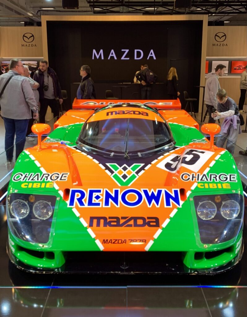 Leggermente fuori da questi schemi, e fra gli stand istituzionali più magnetici del piano, c’è quello di Mazda. Semplice semplice: mette al centro, illuminata come un idolo pagano, e con lo spazio intorno per immortalarla come merita, la 787B vincitrice a Le Mans nel 1991.