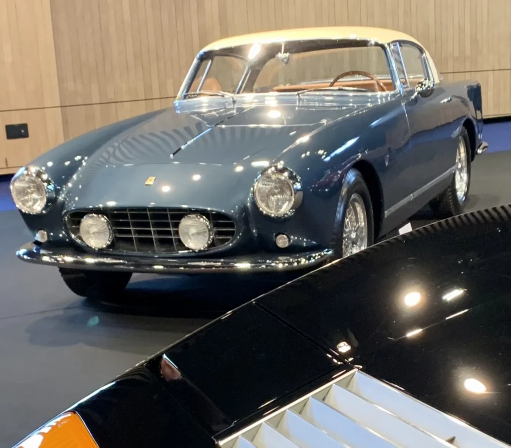– 250 GT Boano: con un esterno bicolore Blu Metallizzato/Bianco e gli interni Cuoio, a valorizzare la GT più “in doppiopetto” (insieme alla Europa) delle coetanee tre litri Ferrari.