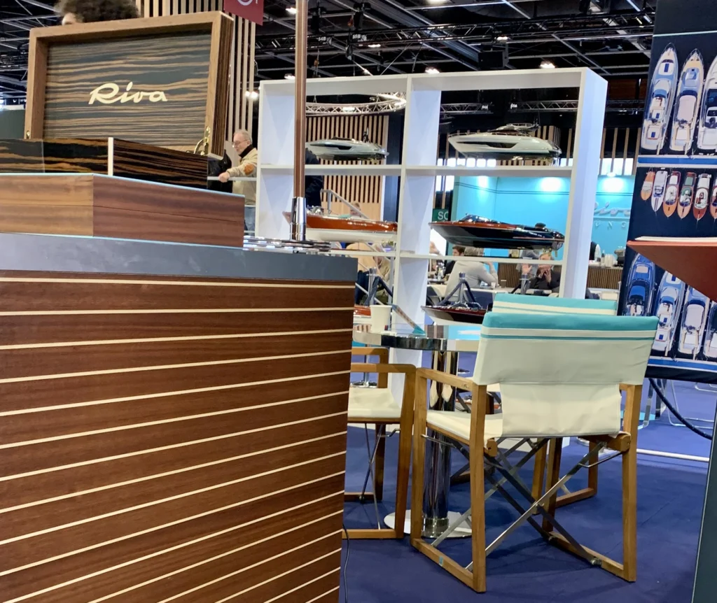 Se sotto di noi gli stand delle auto venivano intervallati da vino e ricambi, qui a spezzare il ritmo compaiono motoscafi Riva, lounge e vetrine di orologi: una zona franca con un Aquarama Special a farle da dogana.